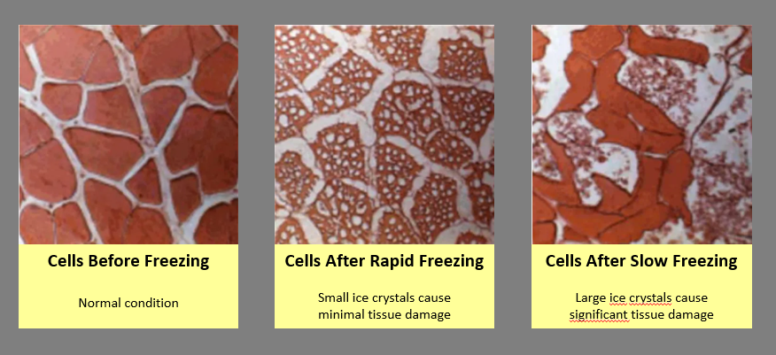 The key to preserving food quality lies in how quickly the product passes through the maximum ice crystal formation zone (−1°C to −5°C / 23°F to 30°F).