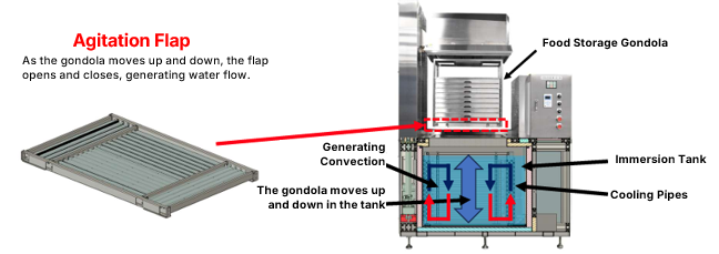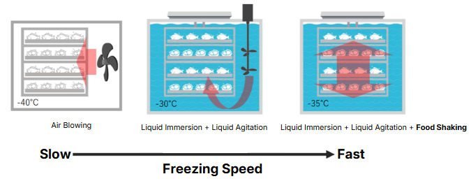 A proprietary vertical oscillation mechanism moves product trays up and down inside a tank filled with ultra-low-temperature liquid.