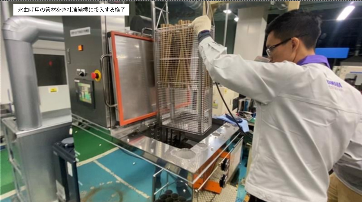 金属パイプの内部に水を封入し凍結させてから曲げ加工を行うこの工程では、氷の硬度と均一性が品質を左右します。